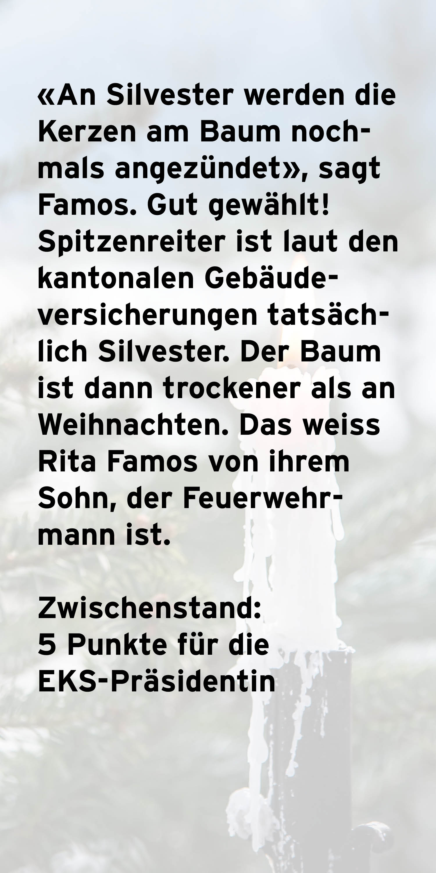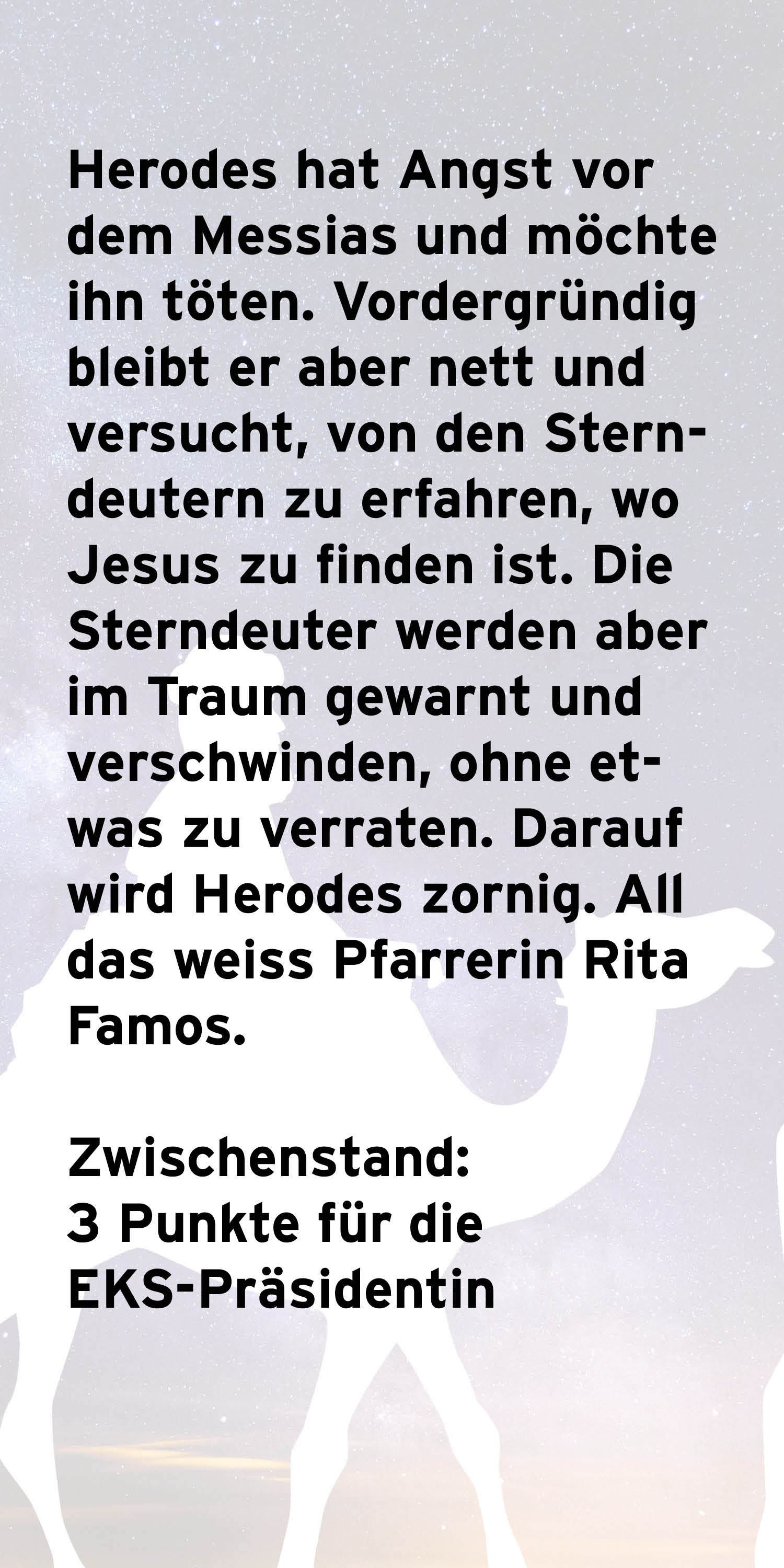 Wissen Sie über Christbäume, Zimtsterne und die Weihnachtsgeschichte Bescheid? Wer war neben Maria und Josef noch im Stall? Testen Sie Ihr Wissen im Adventsquiz und erfahren Sie, ob Sie besser abschneiden als Rita Famos, Präsidentin der Evangelischen Kirche Schweiz (EKS).
