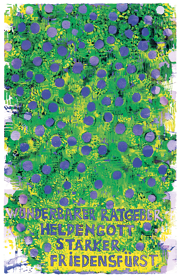 Seine Werke wechseln zwischen klarer Strenge und spielerischer Leichtigkeit. Manche erinnern an Kinderkritzeleien, andere an Graffiti oder Gebotstafeln. Diese Vielfalt macht Buris Zugang faszinierend – und theologisch fruchtbar. Er feiert das Diesseits, indem er das Überirdische durchscheinen lässt. So wird etwa das leuchtende Blau eines Heidelbeerstrauchs, das ihn seit seiner Kindheit an das göttliche Manna erinnert, zum Sinnbild. Seine Schriftbilder sind farbige Meditationen, malerische Predigten, lebendige Kommentare. Sie zeigen, wie Kunst und Theologie sich begegnen: dort, wo das Wort Farbe annimmt und die Farbe zu sprechen beginnt.