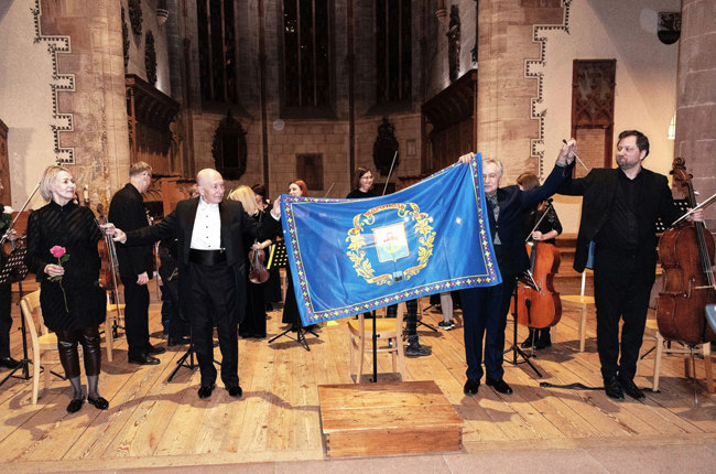 Das Kammerorchester mit der Fahne von Mariupol. | Foto: Horshkova